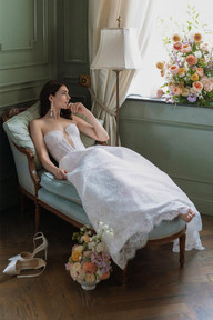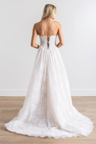 “Meet our Charlotte gown, this strapless ballgown with a sweetheart neckline and corset bodice is a bridal dream featuring our Caterina Lace and a lace up back as the perfect finishing touch.”